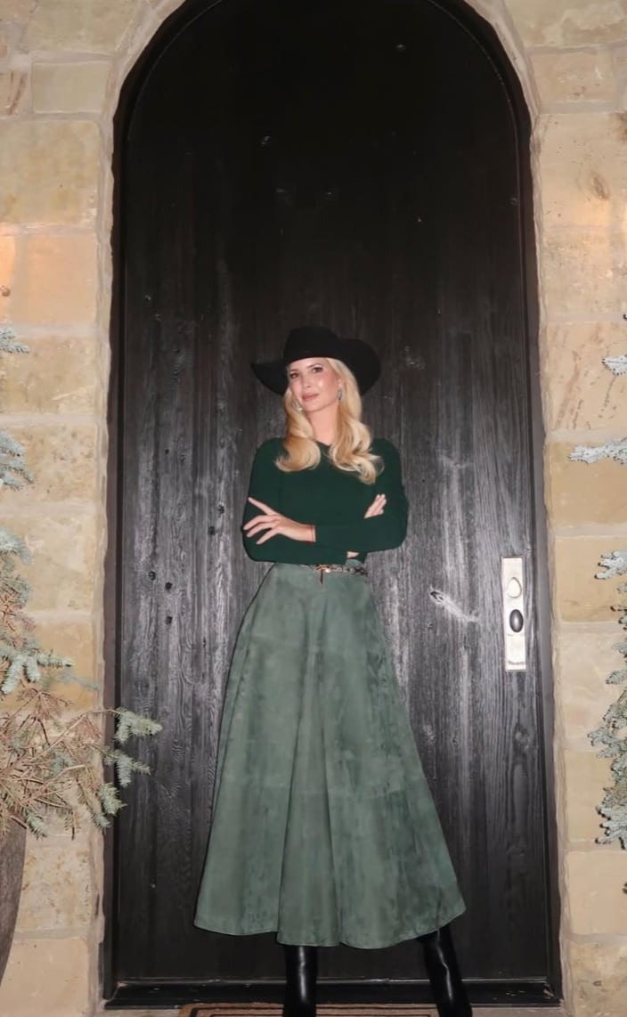 One standout look featured Ivanka in an emerald suede skirt paired with a black Western-style hat and boots — a quiet nod to mountain chic. Her daughter Arabella echoed the elegance in a houndstooth dress, while Joseph and Theodore matched in soft blue sweaters, proving that even off-duty, the family doesn’t abandon visual harmony.