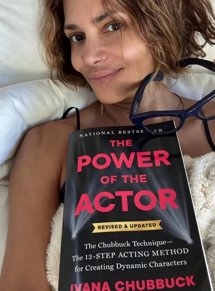 Her natural curls fell softly into a side-parted lob, catching subtle golden highlights, while her glowing skin did all the talking. With black cat-eye glasses perched on her face and a delicate gold chain at her neck, Berry looked relaxed, confident, and entirely unfiltered. In her hands: The Power of the Actor by Ivana Chubbuck — a quiet nod that even moments of rest can still be purposeful.