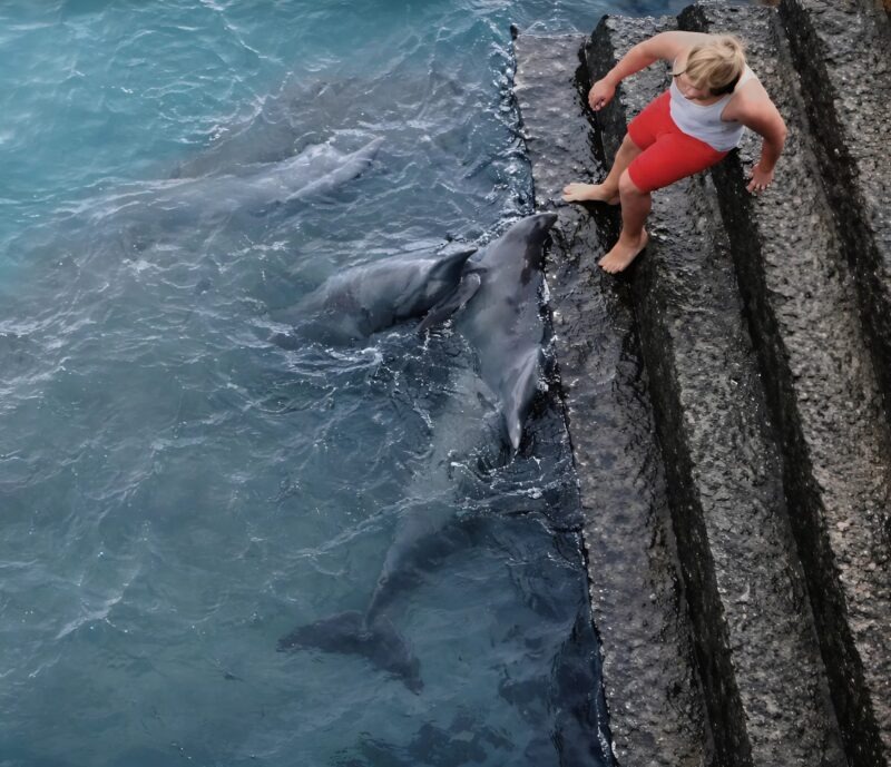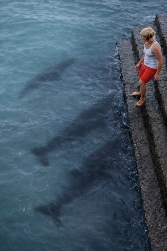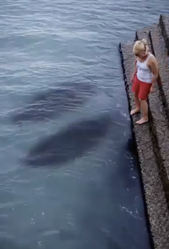 As she looked down into the water, the dark shapes she had earlier assumed were rocks began moving closer to the steps.