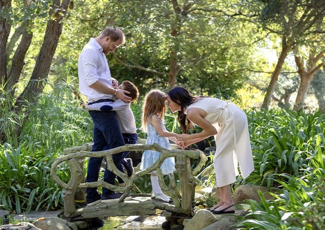 The photograph, set in what appears to be a lush outdoor park, shows the family standing on a small bridge surrounded by greenery. Meghan is seen gazing affectionately at Lilibet, while Harry embraces their son, Prince Archie. True to their usual approach, the couple kept their children’s faces turned away from the camera, maintaining a degree of privacy.
