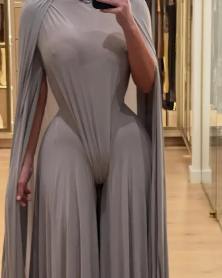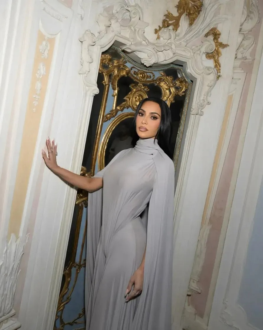 The 44-year-old star appeared in a dramatic gray draped jumpsuit from a couture collection, designed with an unusual silhouette and meant to be worn without traditional undergarments. While Kardashian opted to add lingerie for the award ceremony itself, she also modeled the outfit directly against her skin in a private selfie, which she later shared online.