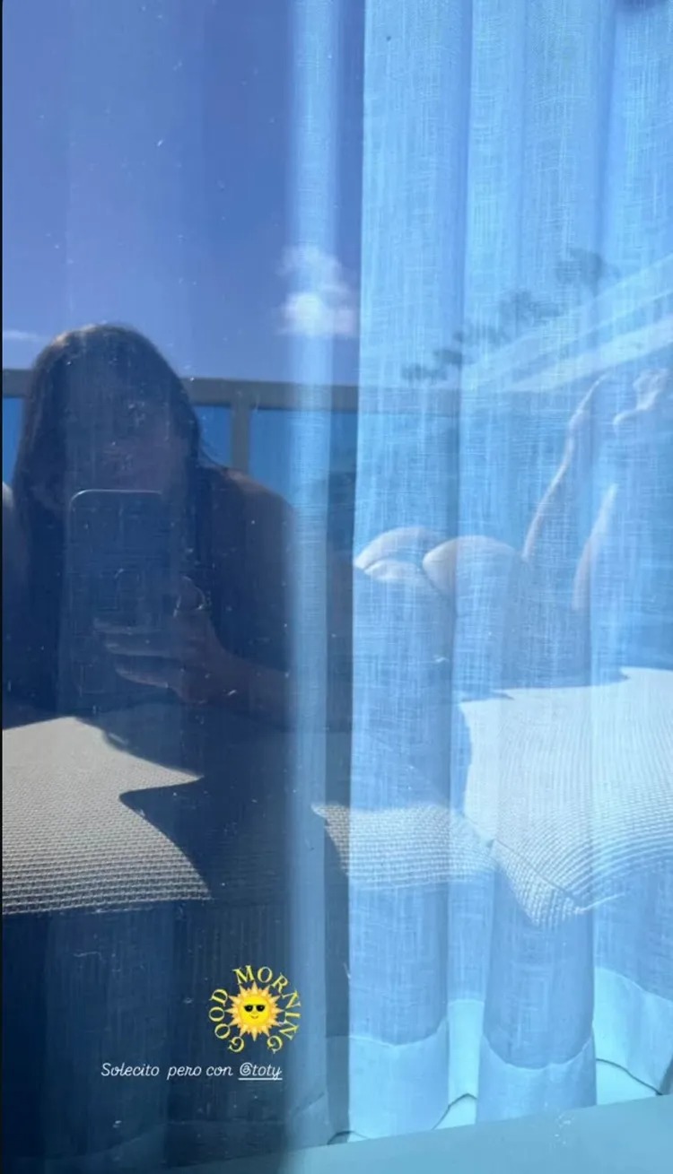 Vergara shared two selfies from her impromptu tanning session, posing topless in tiny black thong bikini bottoms while lounging on her stomach. In the first shot, she captured her reflection in the glass balcony door, delivering a bold, ultra-cheeky angle. She skipped a bikini top entirely, opting instead to protect her skin with her Toty sunscreen while stretched out on a cream waffle-knit-covered chair.