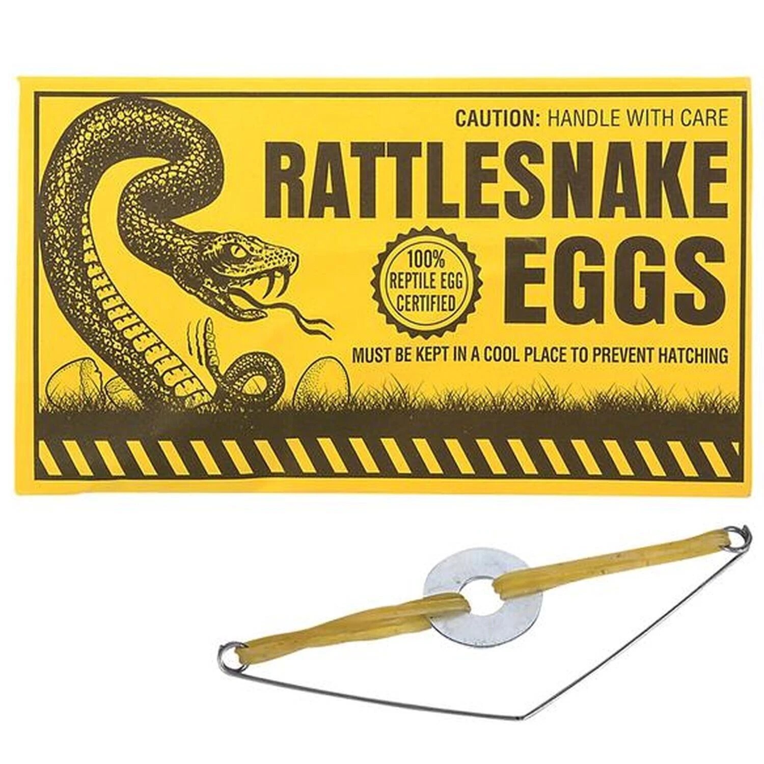 Of course, rattlesnakes don’t actually lay eggs the way the label suggests — the absurd warning is meant to build curiosity before the prank delivers the surprise.