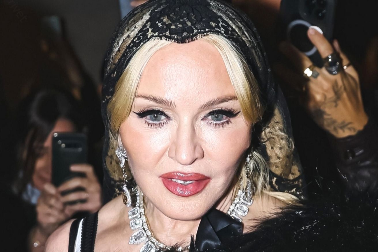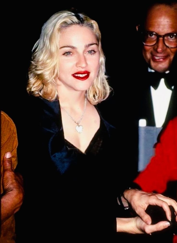 Madonna chose a black mini dress with a lingerie-inspired design, built around a sharply structured corset that sculpted her silhouette. The look was unapologetically sensual, yet controlled — classic Madonna. She layered it with statement tights and an oversized blazer, adding structure to the sultry base. On her feet: traditional loafers, grounding the ensemble with a tailored edge.