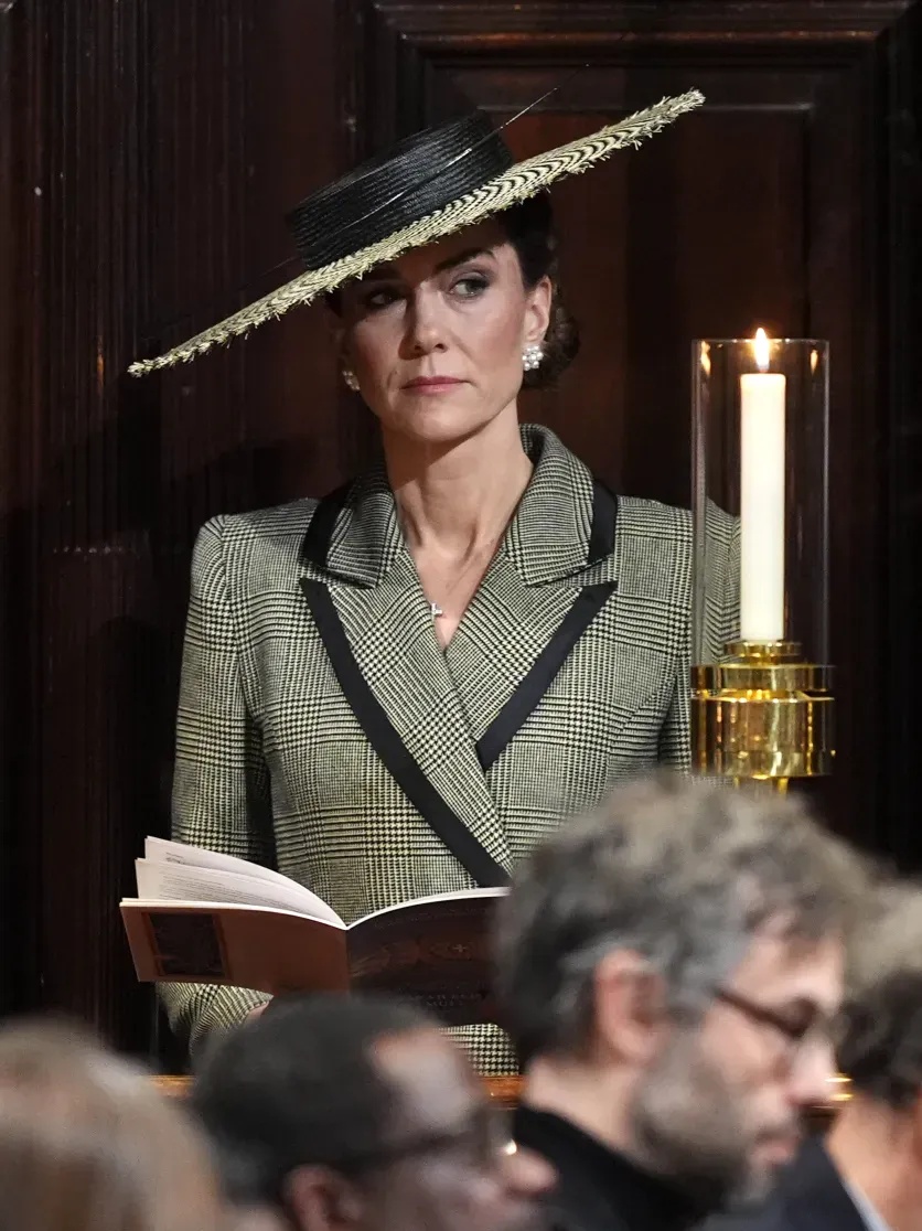 For the occasion, Kate chose a refined yet striking look. She arrived at Canterbury Cathedral wearing a gray checked coat dress by Suzannah London, paired with classic high heels. Her accessories were elegant and timeless—pearl flower-shaped earrings and a Chanel handbag.
