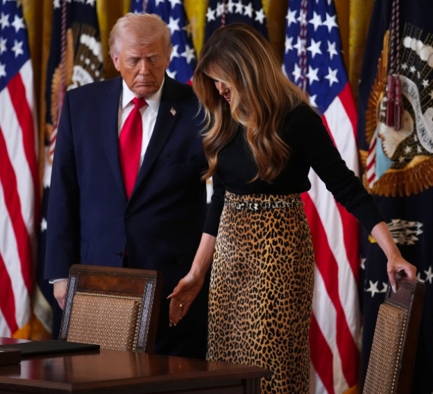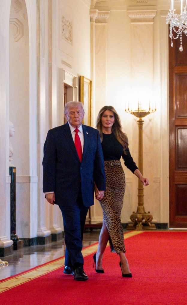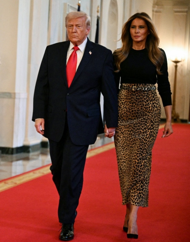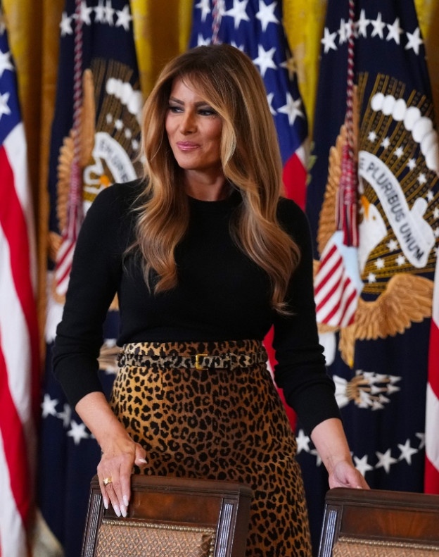 But it was her outfit that truly dominated the moment. Melania wore a fitted pencil skirt in a bold leopard print, designed by Adam Lippes, complete with a built-in belt and a subtle slit at the back. The choice was anything but understated, adding a sharp visual statement to the formal setting.