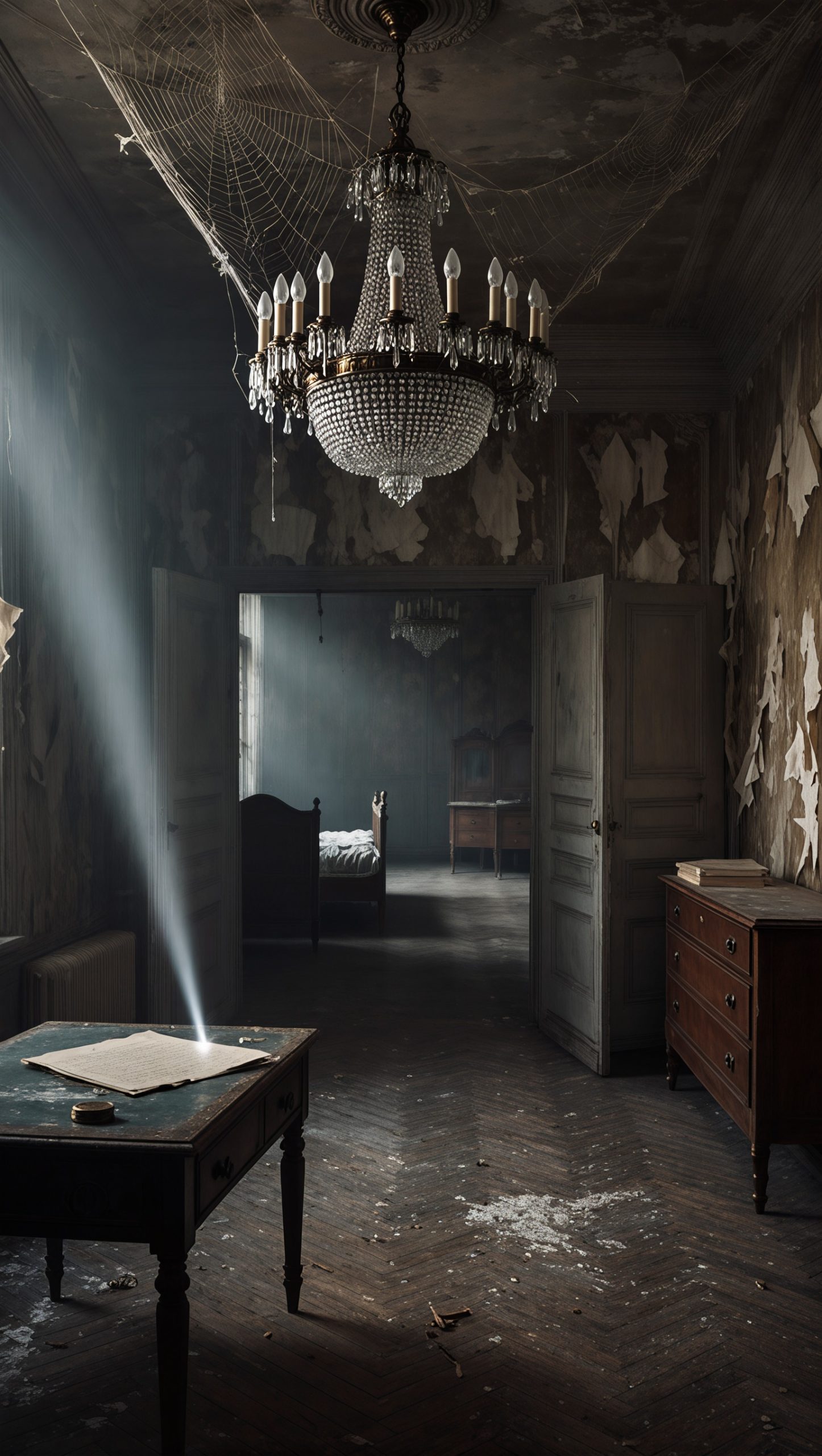 As Sarah stepped deeper, the floorboards groaned beneath her feet. It was as if the house itself was alive, breathing in the silence. Her hands shook as she turned a corner and entered what had once been a grand living room. Cobwebs draped from the chandelier, and a piano sat in the corner, its keys yellowed with time.