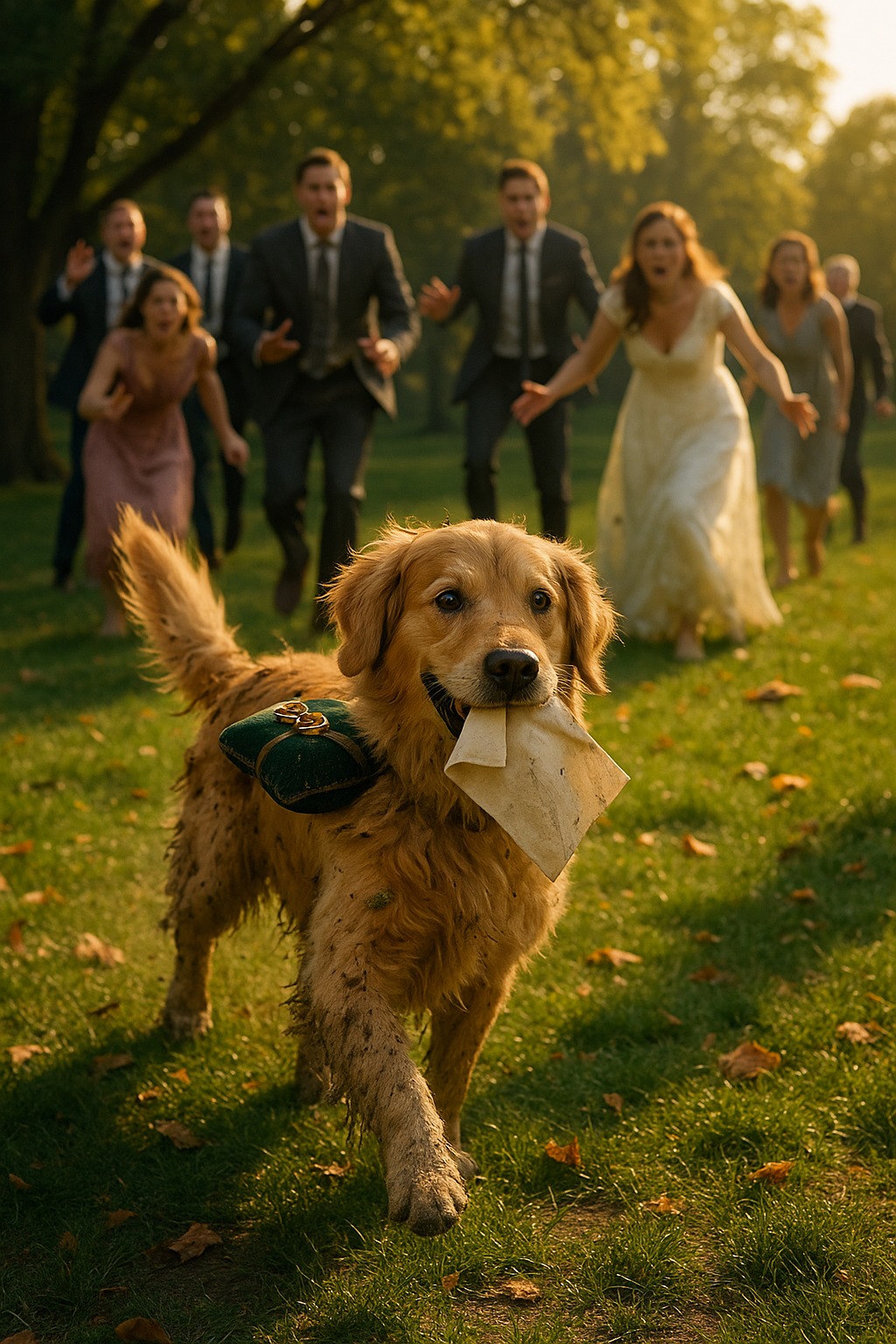Just as the priest reached for the rings, Max’s ears perked up. A bird fluttered outside one of the tall church windows, and in an instant, Max bolted. Gasps filled the room as he bounded past the pews, the velvet pillow bouncing, the rings still tied securely. Someone shouted his name, but he was gone — through the doors, into the street, and out of sight.