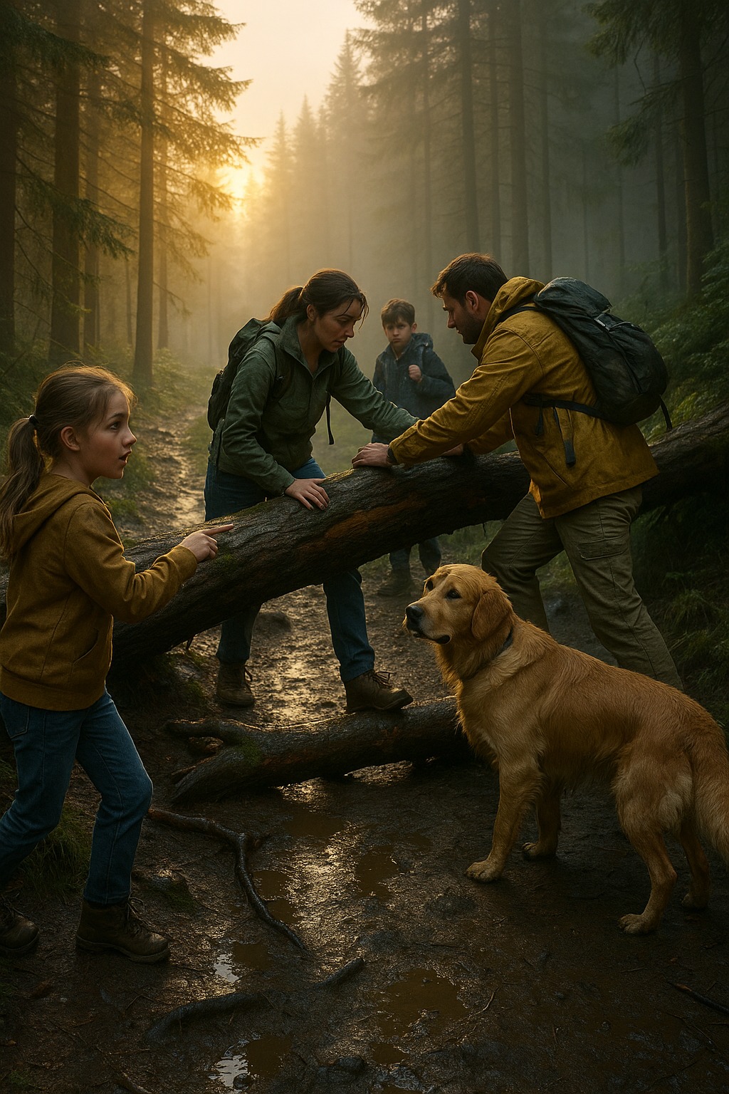 Within moments, the source of the sound became horrifyingly clear. A large tree had fallen across the narrow wooden bridge that led to the trail. Its massive trunk blocked the path entirely. Leaves rustled violently, and branches creaked under the weight of the tree. The children froze, wide-eyed, while Max barked frantically.