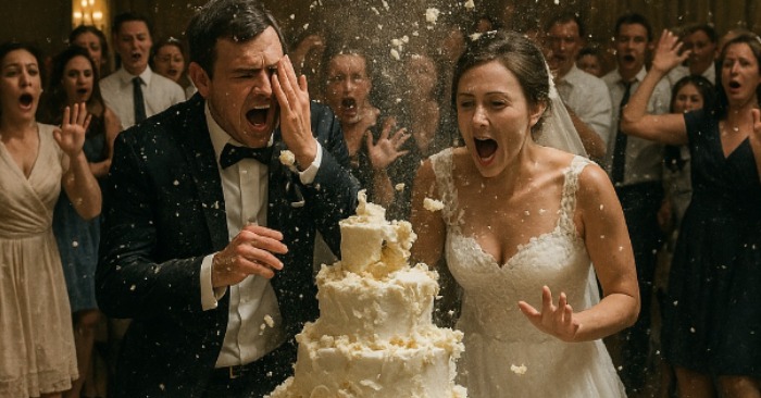Before anyone could react, the cake burst apart with a deafening crack. Frosting flew through the air like confetti, shards of sugar decorations shot across the hall, and the delicate white tiers collapsed in a sticky avalanche. Gasps and screams filled the room as guests shielded their faces. The bride’s pristine gown was splattered with cream, the groom’s suit streaked with chocolate, and the guests closest to the table looked like they had just walked through a food fight.