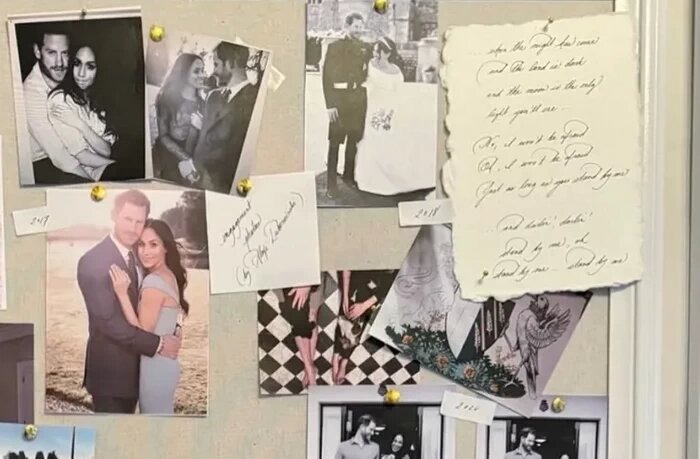 On the small notes beneath the photos are handwritten captions: the year, the location, or a memory of where they were happiest. There’s also a printed page with the lyrics of Ben E. King’s song *“Stand by Me”* and a drawing of Meghan’s personal coat of arms.