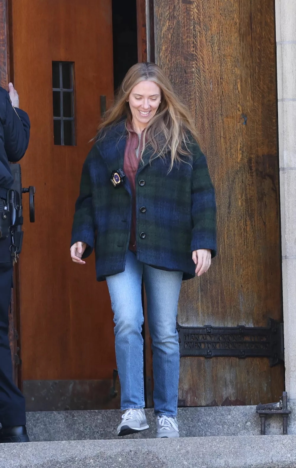Dressing appropriately for the cool spring weather, Scarlett opted for a warm quilted jacket in a classic checkered pattern. She paired it effortlessly with light blue jeans and a soft dusty pink blouse, creating a casual yet put-together look. Her outfit reflected comfort over spectacle, proving once again that off-duty style doesn’t need to be complicated to stand out.