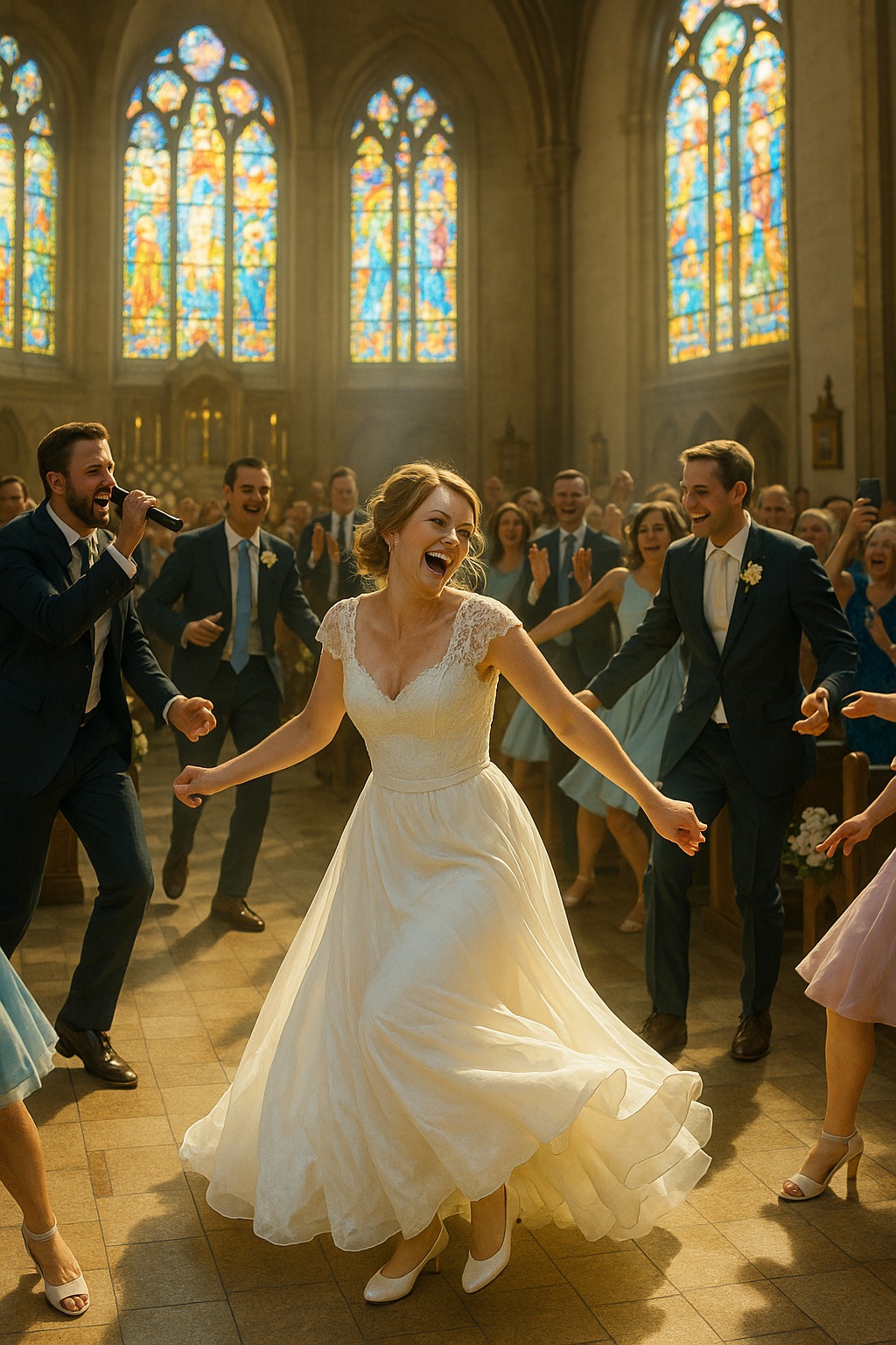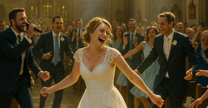 The groom stepped into the aisle, reaching for his bride’s hand. They moved together, clumsy at first, then with perfect synchronicity, like two halves of a whole that had been rehearsing this their entire lives. The bridesmaids circled them, the best man sang louder, and the once-hushed church transformed into a place of pure celebration.