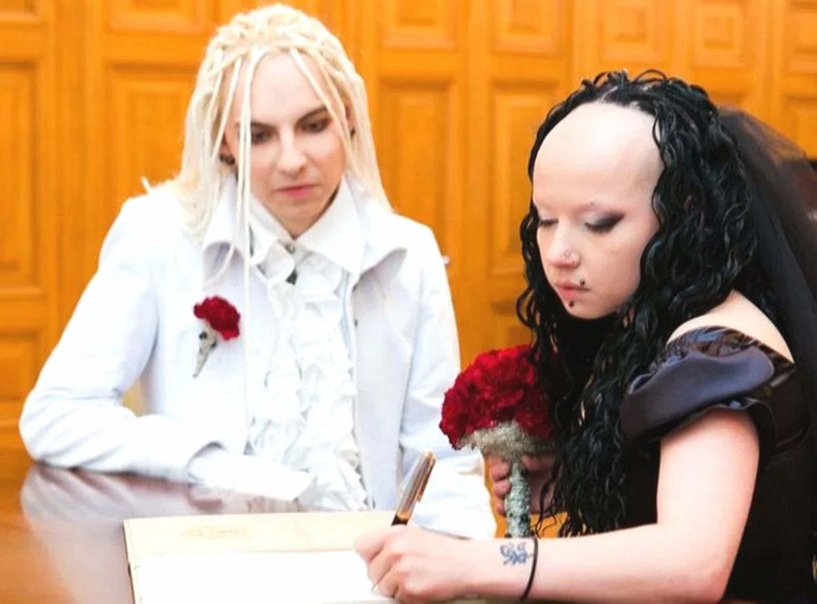 In 2009, the internet couldn’t look away. Photos of a Moscow goth wedding spread across the country, leaving many stunned. The bride arrived at the registry office dressed entirely in black — corset, layers of petticoats, dramatic tulle — holding a bouquet of blood-red roses. Her forehead and eyebrows were shaved clean, her head crowned with jet-black dreadlocks and intense gothic makeup.