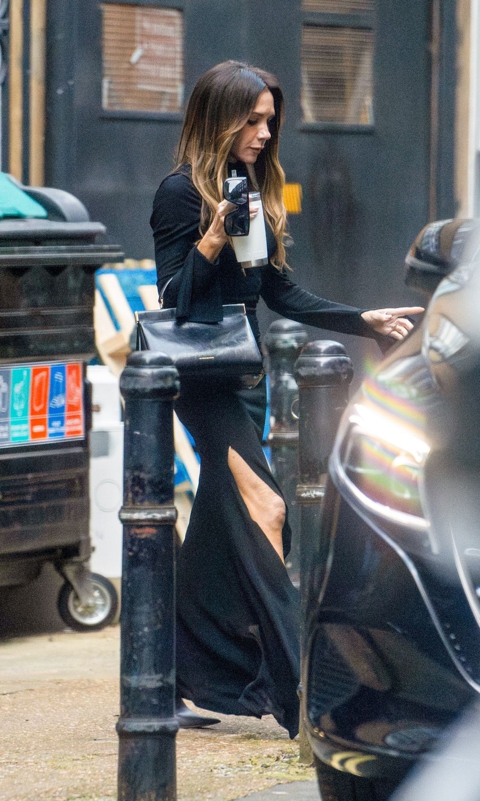 Victoria accessorized with a black handbag, sunglasses, and a water bottle as she climbed into her vehicle.