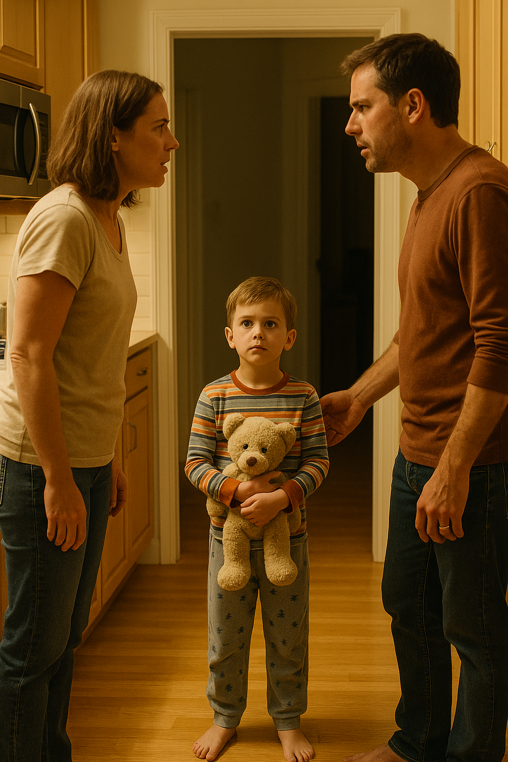 He must have come from the hallway, soft footsteps that neither of us noticed in our haze of anger. When I turned, he was standing in the doorway — our son, clutching his stuffed toy with both hands.