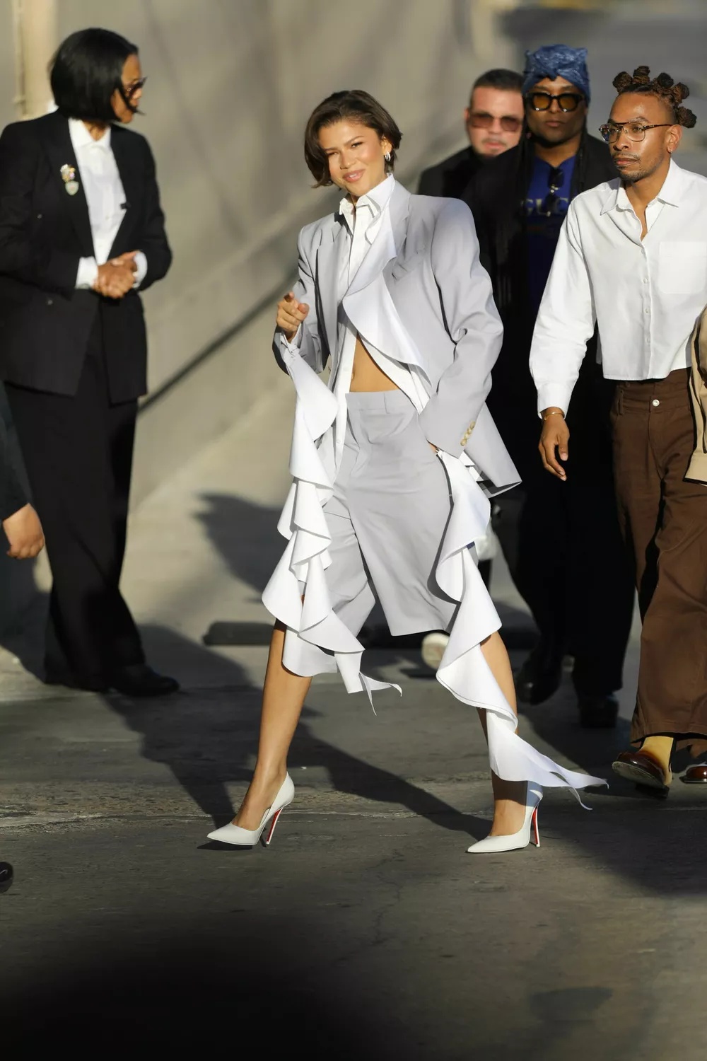 The Euphoria star wore a light gray suit made up of a blazer and tailored bermuda shorts, paired with a white shirt featuring long ruffles and classic white heels. The look was polished, fresh, and in line with her recent preference for lighter shades—something fans believe might not be a coincidence.